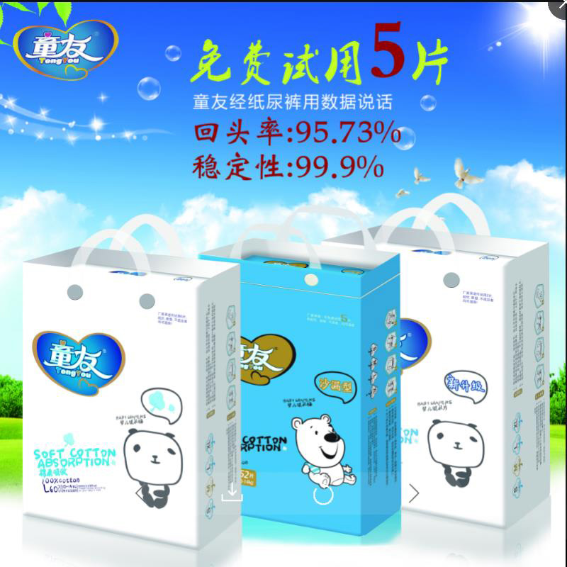品牌名稱:童友 主營(yíng)產(chǎn)品:童友嬰幼兒尿褲,尿片,拉拉褲 品牌特色:超薄雙熱風(fēng),手感柔軟,減少紅屁屁,吸尿量多,不反滲