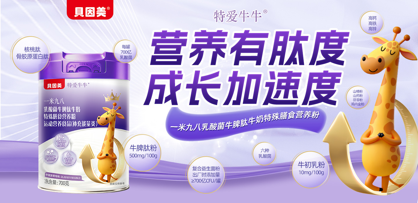貝因美特愛(ài)牛牛一米九八乳酸菌牛脾肽牛奶特殊膳食營(yíng)養(yǎng)粉,中國(guó)發(fā)明專利:ZL201811503284.0,安全放心!每100添加牛脾肽粉500mg,牛初乳粉10mg,復(fù)合益生菌粉出廠時(shí)添加量≥700億CFU/罐,科學(xué)配方,優(yōu)質(zhì)營(yíng)養(yǎng)!專為3-15歲兒童骨骼生長(zhǎng)黃金期設(shè)計(jì),營(yíng)養(yǎng)有肽度,成長(zhǎng)加速度!