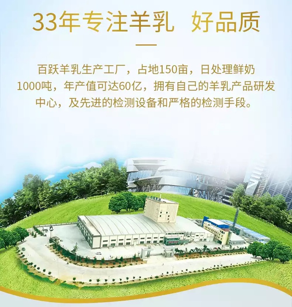 西安百躍羊乳集團有限公司是一家集羊乳研發(fā)、收購、生產(chǎn)、銷售于一體的集團化公司。成立于1985年,位于西安市閻良區(qū),主要從事羊乳制品的研發(fā)、生產(chǎn)、銷售和服務(wù),具有自建奶源基地,是國內(nèi)規(guī)模最大的羊乳加工企業(yè)。目前,已發(fā)展成一家擁有多個子公司的集團化企業(yè),擁有百躍羊乳(合水)古象有限公司、百躍羊乳(南寧)有限公司、西安國品乳業(yè)有限公司、西安御恭羊乳有限公司、西安御寶羊乳品營銷有限公司,及控股公司陜西百躍優(yōu)利士乳業(yè)有限公司。現(xiàn)有職工238人,總資產(chǎn)達(dá)10 億元,無負(fù)債。
