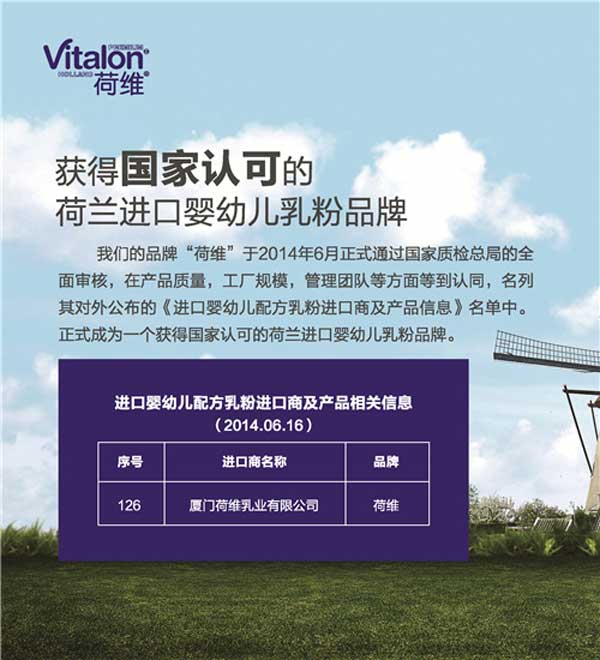 荷維嬰幼兒配方奶粉為荷維乳業(yè)與工廠合作,采用優(yōu)質的荷蘭奶源,依據(jù)聯(lián)合國糧農(nóng)組織(FAO)和世界衛(wèi)生組織(WHO)食品法典要求,特別參照中國嬰幼兒的生理特點和營養(yǎng)需求共同研制而成的。