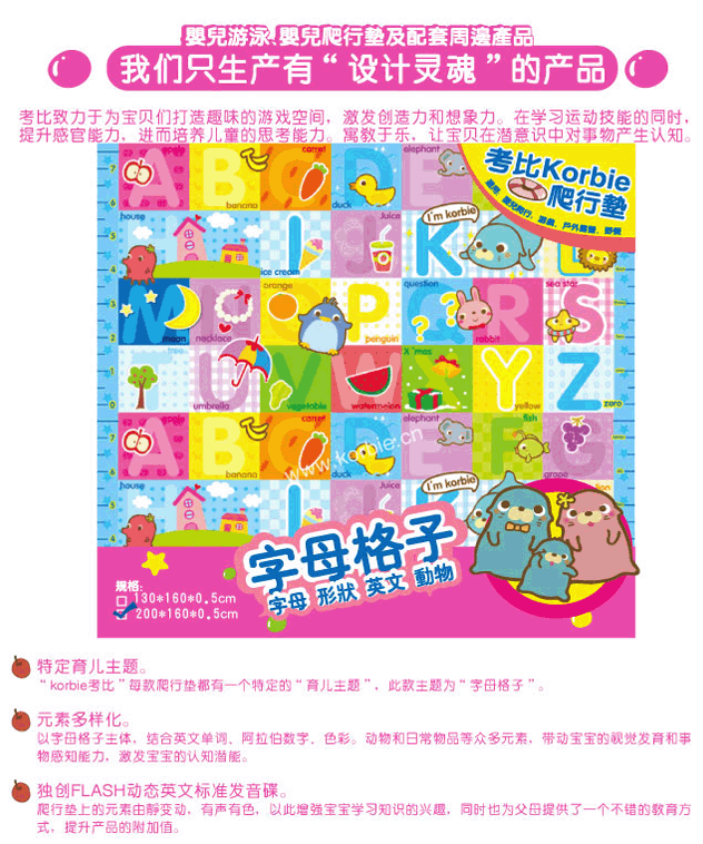 “考比Korbie”嬰兒爬行墊,是杭州杰弗瑞嬰童用品有限公司旗下的主打品牌產(chǎn)品。Korbie,源自德文“korb”,是“籃子”的意思?急菿orbie,給爸爸媽媽一個(gè)放心的“籃子”,為寶寶的成長(zhǎng)創(chuàng)造一個(gè)安全、舒適和快樂的小天地。