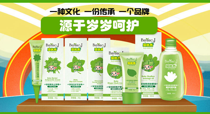 “貝優(yōu)杰”是公司傾心打造研發(fā)的核心品牌,秉承“本草呵護(hù)”的品牌核心理念,堅(jiān)持以“綠色、安全、溫和、有效”為基本出發(fā)點(diǎn),積極打造一個(gè)更安全、更放心的嬰童護(hù)理品牌。它以其“綠色、健康、生動(dòng)”的卡通形象,深受消費(fèi)者喜愛。貝優(yōu)杰始終堅(jiān)持本草護(hù)理理念,深入探索嬰童階段的生理特征,貼心呵護(hù)孩子們的身體健康!