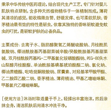 潤本草本防蚊沐浴露秉承中華傳統(tǒng)中醫(yī)藥理論,結合現(xiàn)代生產(chǎn)工藝,專門針對嬰兒肌膚特點研制,含多種天然植物精華于一體,精制而成。薄荷其清涼的感覺,能收縮微血管、舒緩發(fā)癢、也可柔軟肌膚;香茅精油有效特性是驅蟲,依靠其獨特的香味驅蚊,避免蚊蟲的叮咬,是驅蚊護膚的必備良品。