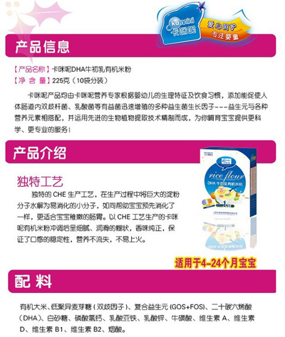 卡咪呢有機(jī)米粉系列是專為中國(guó)寶寶設(shè)計(jì)的營(yíng)養(yǎng)輔食,選用有機(jī)大米,科學(xué)搭配維生素AD等維生素,還特別添加;撬帷HA、AA等有助智力發(fā)育的營(yíng)養(yǎng)成分,富含15種營(yíng)養(yǎng)素。現(xiàn)上?ㄟ淠啬笅胗闷酚邢薰久嫦蛉珖(guó)空白市場(chǎng)區(qū)域誠(chéng)招卡咪呢有機(jī)米粉代理商。