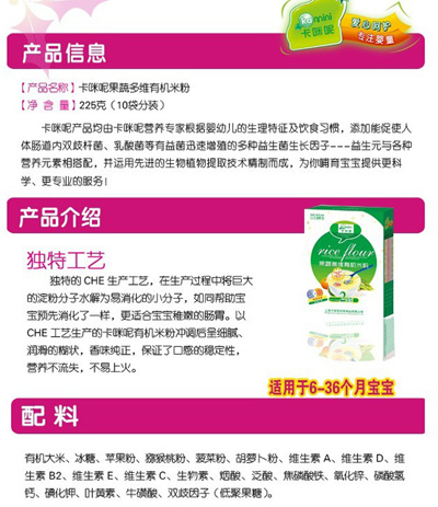 卡咪呢果蔬多維有機(jī)米粉是上?ㄟ淠啬笅胗闷酚邢薰酒煜庐a(chǎn)品,精選有機(jī)大米和多種新鮮水果、水彩精心研制而成,適合6-36個月的寶寶。該款產(chǎn)品科學(xué)配方,富含維生素A維生素D等多種維生素,還特別添加DHA、AA和;撬嵋嬷菭I養(yǎng)組合,營養(yǎng)豐富好吸收。