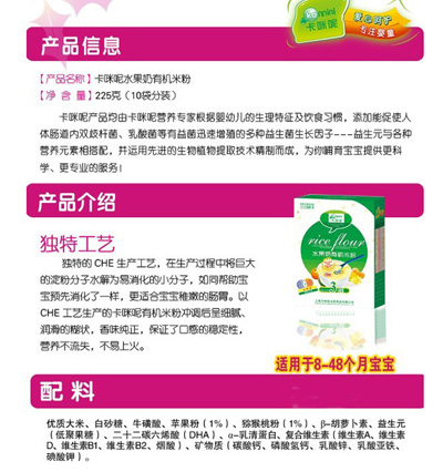 卡咪呢有機米粉系列是專為中國寶寶設計的營養(yǎng)輔食,選用有機大米,科學搭配維生素AD等維生素,還特別添加;撬、DHA、AA等有助智力發(fā)育的營養(yǎng)成分,富含15種營養(yǎng)素,F(xiàn)上海卡咪呢母嬰用品有限公司面向全國空白市場區(qū)域誠招卡咪呢有機米粉代理商。