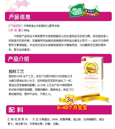 卡咪呢乳清蛋白嬰幼兒營養(yǎng)米粉是上?ㄟ淠啬笅胗闷酚邢薰酒煜庐a(chǎn)品,精選優(yōu)質(zhì)大米制作,特別添加乳清蛋白和益生元,提高寶寶抵抗力,促進寶寶changdao的消化吸收,上市以來廣受父母消費者的青睞。