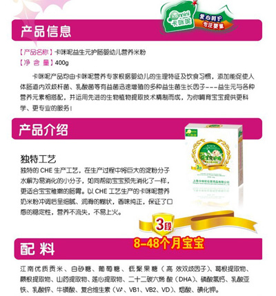 卡咪呢有機(jī)米粉系列是專為中國寶寶設(shè)計(jì)的營養(yǎng)輔食,選用有機(jī)大米,科學(xué)搭配維生素AD等維生素,還特別添加牛磺酸、DHA、AA等有助智力發(fā)育的營養(yǎng)成分,富含15種營養(yǎng)素。現(xiàn)上?ㄟ淠啬笅胗闷酚邢薰久嫦蛉珖瞻资袌鰠^(qū)域誠招卡咪呢有機(jī)米粉代理商。