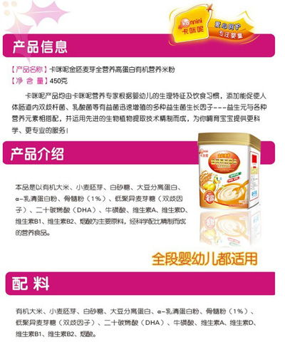 卡咪呢有機(jī)米粉系列是專為中國(guó)寶寶設(shè)計(jì)的營(yíng)養(yǎng)輔食,選用有機(jī)大米,科學(xué)搭配維生素AD等維生素,還特別添加;撬、DHA、AA等有助智力發(fā)育的營(yíng)養(yǎng)成分,富含15種營(yíng)養(yǎng)素。現(xiàn)上?ㄟ淠啬笅胗闷酚邢薰久嫦蛉珖(guó)空白市場(chǎng)區(qū)域誠招卡咪呢有機(jī)米粉代理商。