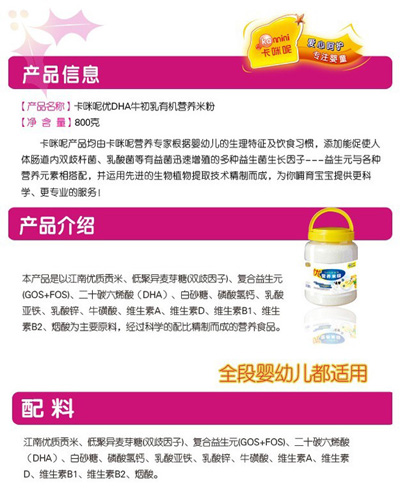 卡咪呢乳清蛋白嬰幼兒營養(yǎng)米粉是上?ㄟ淠啬笅胗闷酚邢薰酒煜庐a(chǎn)品,精選優(yōu)質(zhì)大米制作,特別添加乳清蛋白和益生元,提高寶寶抵抗力,促進(jìn)寶寶changdao的消化吸收,上市以來廣受父母消費(fèi)者的青睞。