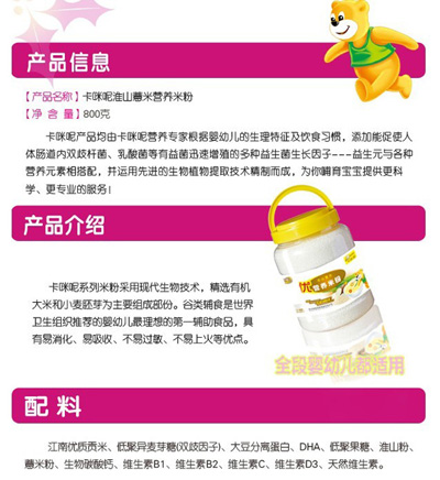 卡咪呢有機(jī)米粉系列是專為中國寶寶設(shè)計(jì)的營養(yǎng)輔食,選用有機(jī)大米,科學(xué)搭配維生素AD等維生素,還特別添加牛磺酸、DHA、AA等有助智力發(fā)育的營養(yǎng)成分,富含15種營養(yǎng)素,F(xiàn)上?ㄟ淠啬笅胗闷酚邢薰久嫦蛉珖瞻资袌鰠^(qū)域誠招卡咪呢有機(jī)米粉代理商。