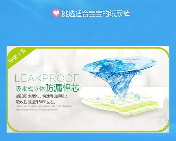 柔薄芯層結(jié)構(gòu),采用全芯高科技結(jié)構(gòu)設(shè)計(jì)、薄軟透氣、零接觸摩擦感、不起坨、不斷層、輕輕的呵護(hù),給寶寶體貼的愛(ài)。綿柔無(wú)紡布透氣底膜,及時(shí)散發(fā)悶熱濕氣,減少寶寶皮膚的刺激及傷害。全新3D打孔大珍珠面層,瞬間吸收,加倍干爽,連通吸收芯成(多層鎖水)系統(tǒng),有效吸收和鎖住更多尿液,讓寶寶屁屁更加干爽。雙重防漏立體設(shè)計(jì),舒適柔軟貼合腿部,防止尿尿往兩邊側(cè)漏,給寶寶自由自在,盡情活動(dòng)的舒爽空間。人性化合身曲線剪裁,專(zhuān)為中國(guó)寶寶設(shè)計(jì)的合身檔剪裁,更加貼合寶寶,腿部及臀部曲線,減少腿部摩擦與壓力。背部彈性腰圍貼身防后漏,無(wú)論寶寶坐、騎、爬等,大環(huán)腰彈性腰圍能自然伸縮,貼身服帖。