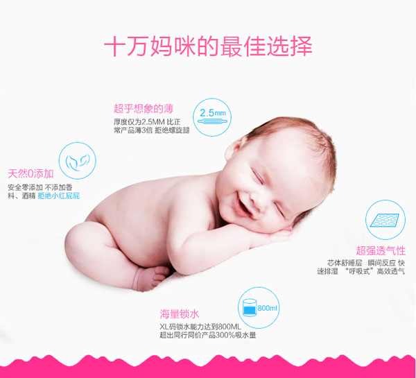 360°彈力貼身腰圍,超柔、超舒適。超柔3D打孔大珍珠面層,有效減少皮膚接觸,清新干爽,呵護寶寶小屁屁。干爽升級,雙層舒爽芯,進口住友+三大雅高分子完美配比,瞬間吸收、牢固鎖水。熱風新微孔高效排氣底膜,及時排除悶熱濕氣。 遇濕變色魔幻尿顯,及時發(fā)現(xiàn)寶寶的小秘密。自動外翻立體防側漏隔邊,防止側漏,寶媽更放心。根據(jù)中國寶寶體型設計,貼合臀部曲線,伸展自如。