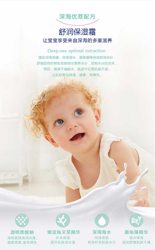 Bresican貝施康舒潤保濕霜是 “深海優(yōu)萃”系列的滋養(yǎng)產(chǎn)品,根據(jù)嬰兒特殊肌膚PH特點研制,從深海中萃取自然純凈成分,配方做到純正安全,讓媽媽心安!