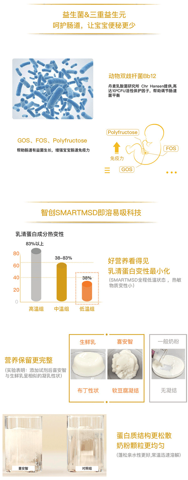 金裝喜安智嬰兒配方奶粉即溶優(yōu)吸收,寶寶少上火,采用創(chuàng)新科技優(yōu)異溶解技術(shù),是奶粉顆粒均勻蓬松,37°常溫水沖調(diào)可迅速?gòu)氐兹軇,即沖即飲,使容易變性的熱敏營(yíng)養(yǎng)物質(zhì)(蛋白質(zhì)、鈣等)的營(yíng)養(yǎng)損失小化,并大程度避免免疫物質(zhì)的失活,保障營(yíng)養(yǎng)物質(zhì)的完整性和活性。