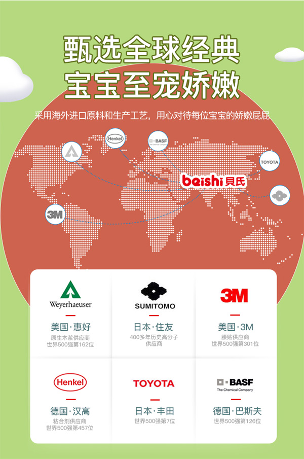 采用海外進(jìn)口原料和生產(chǎn)工藝,用心對待每位寶寶的嬌嫩屁屁