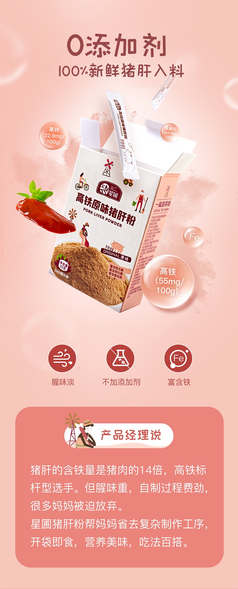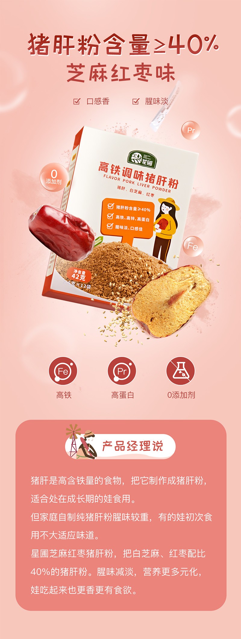 星圃高鐵原味豬肝粉,以豬肝、白芝麻、紅棗為主要原料,10重工藝,去筋去腥,腥味減半,營(yíng)養(yǎng)翻倍。其中,豬肝粉含量≥40%,食材搭配均衡,高鐵、高鋅、高蛋白,營(yíng)養(yǎng)豐富。芝麻紅棗味,口感香,腥味淡。0添加,食用更放心。
