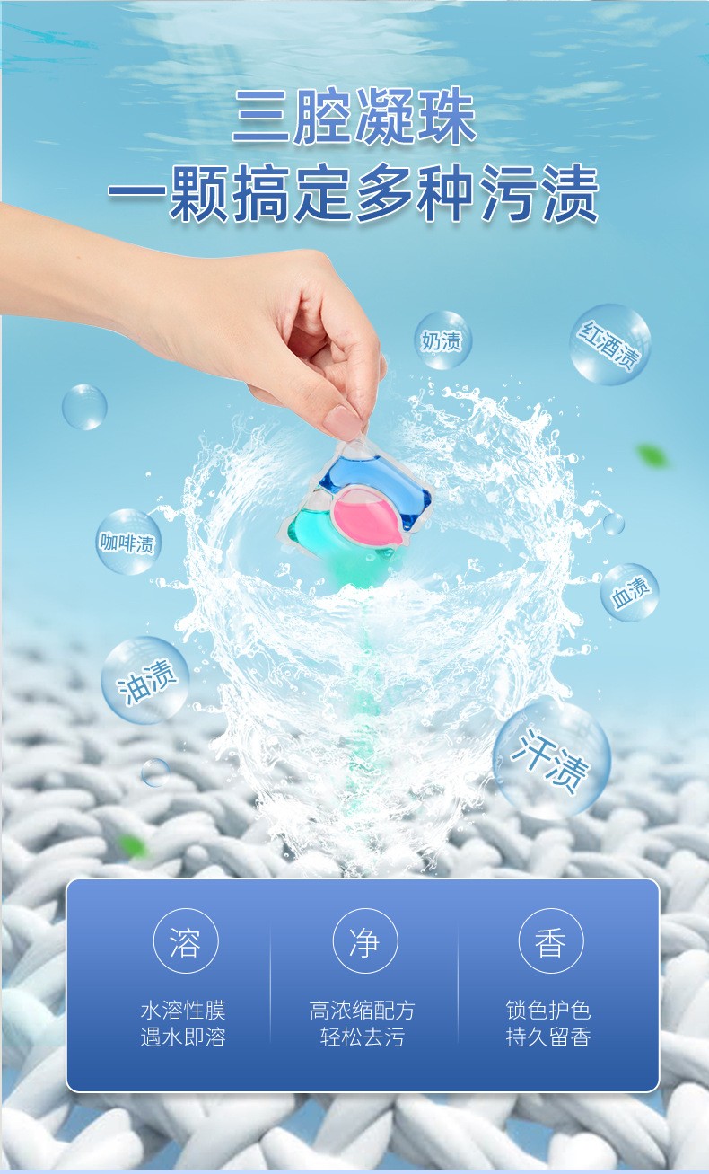 洗衣凝珠采用生物酶技術(shù),4倍濃縮,八倍潔凈,迅速分解污漬、油脂,除螨抑菌。精美凝珠,進(jìn)口水溶膜,遇水即溶,深入清潔,易漂易洗,無(wú)殘留物,持久留香。