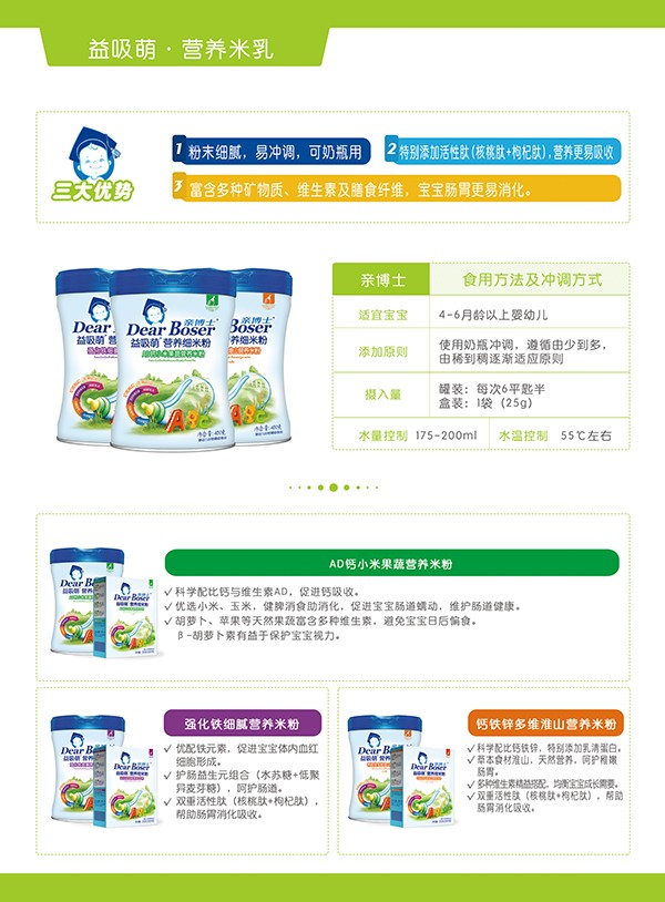 輔食添加,更多媽媽選擇親博士,尤其是這款親博士益吸萌鈣鐵鋅多維淮山營養(yǎng)米粉高品質(zhì)輔食,甄選食材,科學配比,滿足成長階段的營養(yǎng)需求,健康美味,給孩子帶來不一樣的口糧體驗。受到廣大經(jīng)銷商以及門店老板們的認可。