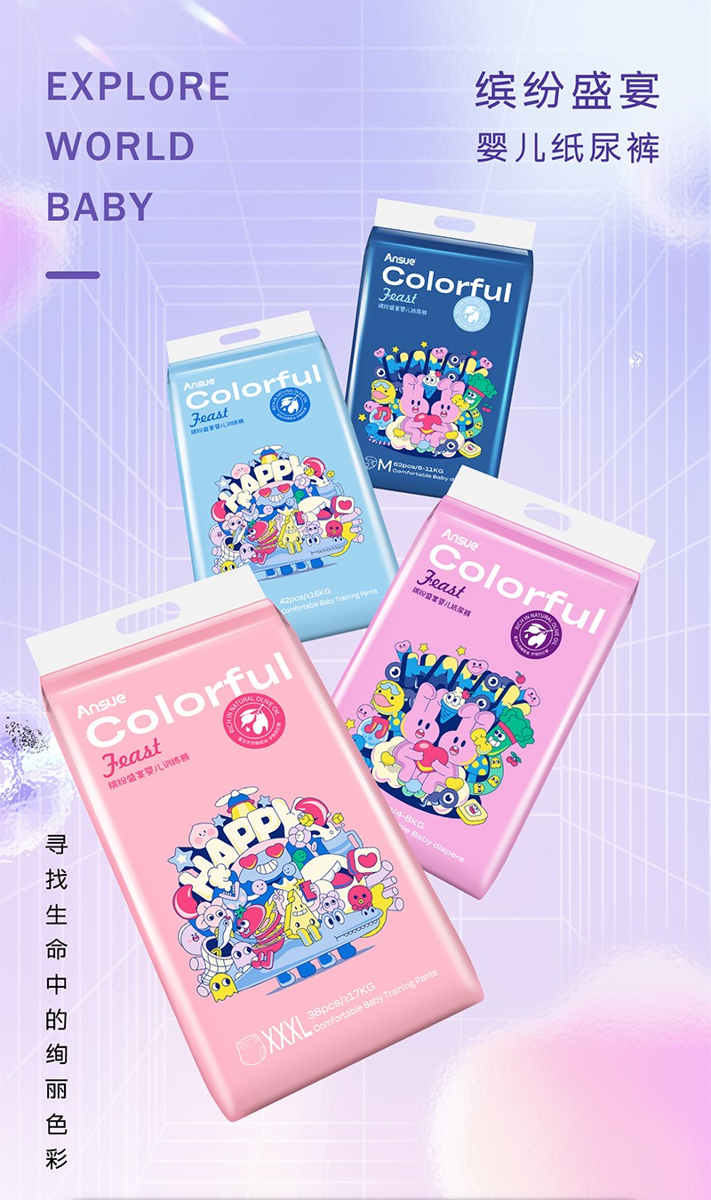 繽紛盛宴嬰兒紙尿褲/拉拉褲,云般柔軟,專為嬰兒肌,多彩設(shè)計(jì)+6代芯體,守護(hù)寶寶每一步。1片瞬吸,8次尿量。瞬吸高分子,一夜一片睡香香;3D表層+智選優(yōu)材,筑牢“屁屁防護(hù)盾”;3D雙層柔點(diǎn)觸感,拒絕潮濕,時(shí)刻干爽親膚;多重品質(zhì)檢驗(yàn),嚴(yán)選優(yōu)材,安全體驗(yàn)有保障;3段式高彈腰圍,柔軟全包裹,隨動作變換自由拉伸,貼身防護(hù)不側(cè)漏,給寶寶可感知的舒適;萃取橄欖油精華,呵護(hù)嬌嫩肌,有效防紅臀。搭配科學(xué)護(hù)理提示,換褲清潔、過敏應(yīng)對全涵蓋。選安秀兒,給寶寶“臀”級寵愛~