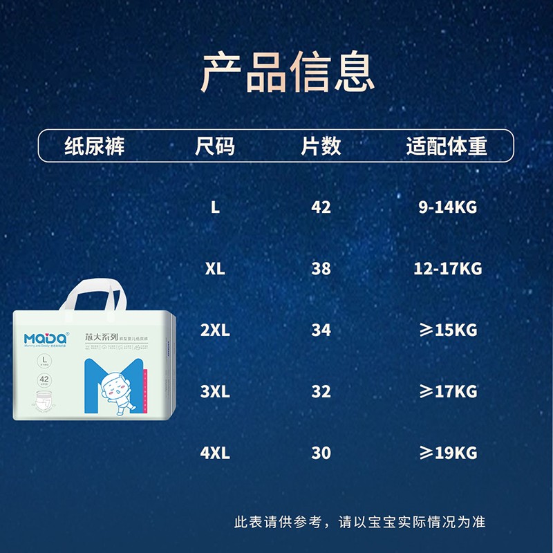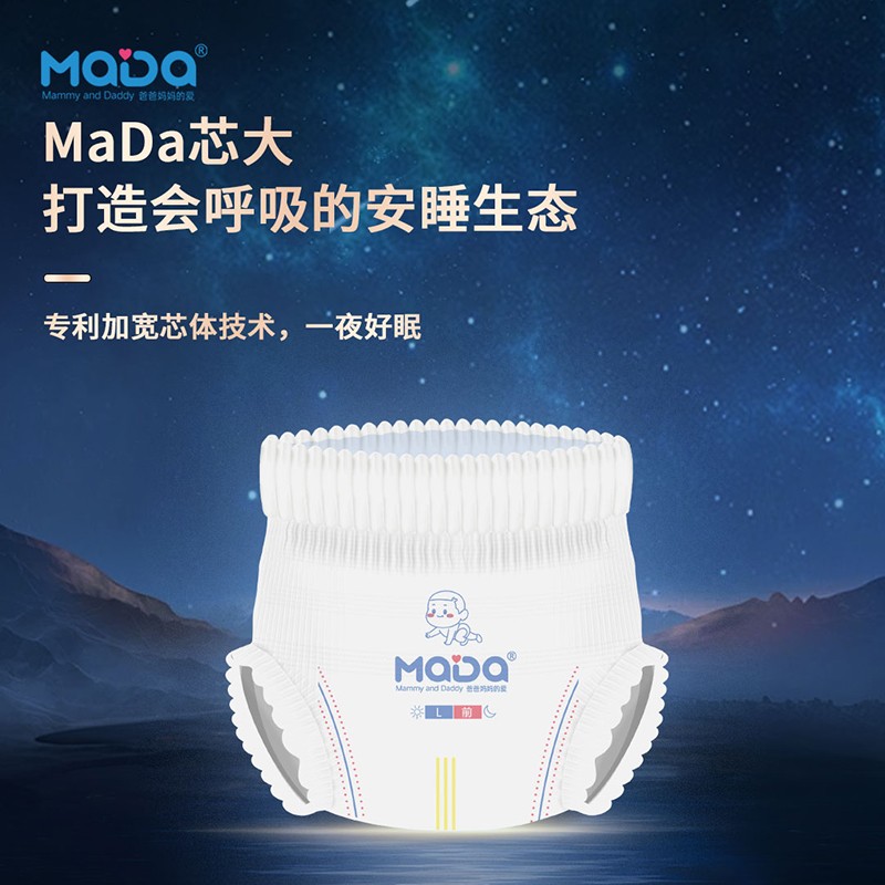 MaDa芯大系列褲型嬰兒紙尿褲,芯大20%,不漏好安心。薄若蟬翼,隔濕透氣,泡點(diǎn)觸膚,干爽舒適,云朵腰圍,柔軟不勒,芯體加寬,瞬吸瞬干。