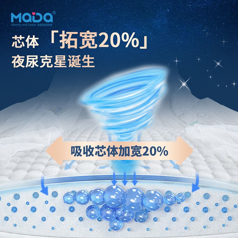 MaDa芯大系列褲型嬰兒紙尿褲,芯大20%,不漏好安心。薄若蟬翼,隔濕透氣,泡點(diǎn)觸膚,干爽舒適,云朵腰圍,柔軟不勒,芯體加寬,瞬吸瞬干。