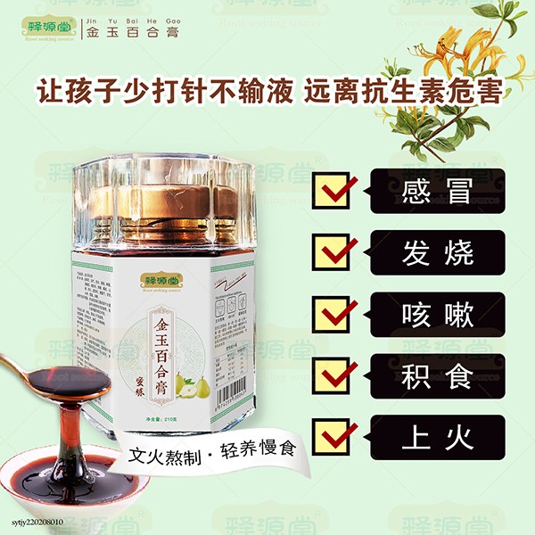釋源堂金玉百合膏,藥食同源配方,綠色又健康!科學配比,富含草本植物精華,如金銀花、玉竹、百合、黃精、魚腥草、枇杷葉、桔梗、橘皮、山楂、杏仁等等,更添加天然蜂蜜,經(jīng)多道嚴格工序精心熬制而成,膏體濃稠,色澤透亮,口感純正,美味又營養(yǎng),貼心守護全家健康!