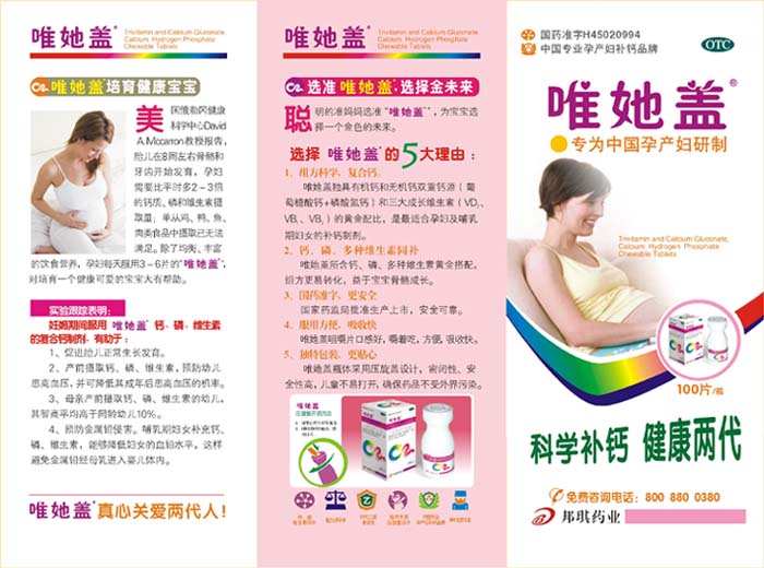 唯她蓋是湖北名珠藥業(yè)有限公司旗下的品牌,唯她蓋主要服務(wù)于婦幼保健,國家藥監(jiān)局批準(zhǔn)上市,安全可靠。唯她蓋獨(dú)具有機(jī)鈣和無機(jī)鈣雙重鈣源(葡萄糖酸鈣+磷酸氫鈣)和三大成長維生素(VD2、VB1、VB2)的黃金配比,是最適合孕婦和哺乳期婦女的補(bǔ)鈣制劑。唯她蓋所含鈣、磷、多種維生素黃金搭配,組方更易轉(zhuǎn)化,益于寶寶骨骼成長。唯她蓋咀嚼片口感好,嚼著吃,方便,吸收快。唯她蓋瓶體采用壓旋蓋設(shè)計(jì),密閉性、安全性高,兒童不易打,確保藥品不受外界污染。唯她蓋由邦琪藥業(yè)集團(tuán)的總廠生產(chǎn)市。采用最高等級(jí)原料藥,集團(tuán)總工全程嚴(yán)格控制生產(chǎn)工藝流程,確保每一片唯她蓋的最高品質(zhì)。