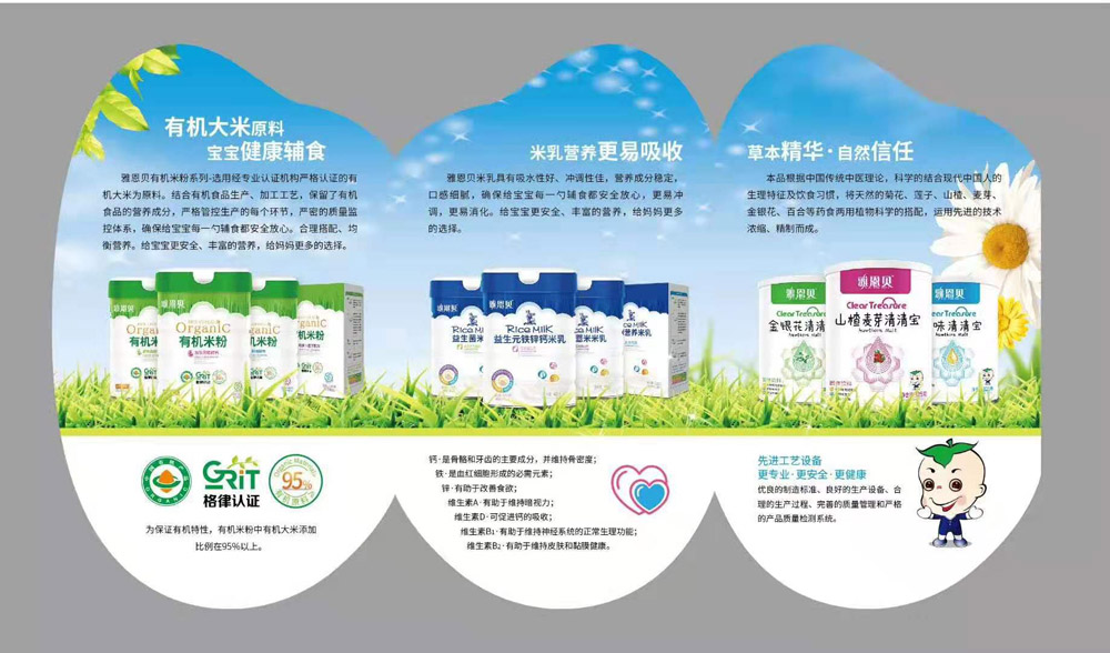 “雅恩貝”是江西永正食品有限公司旗下主打品牌,公司成立于2016年5月26日,是國家制定新政后的新型嬰幼兒輔食企業(yè)。企業(yè)已經(jīng)通過嬰幼兒配方谷粉食品生產(chǎn)許可證(證號:SC10636012111666)和ISO22000食品安全體系認(rèn)證。本著“專業(yè)執(zhí)著,精益求精”的工作原則,秉承“品質(zhì)至上,客戶為本”經(jīng)營理念,研制生產(chǎn)了適合嬰幼兒健康營養(yǎng)需要的米粉類,清火寶類,葡萄糖類等系列產(chǎn)品。