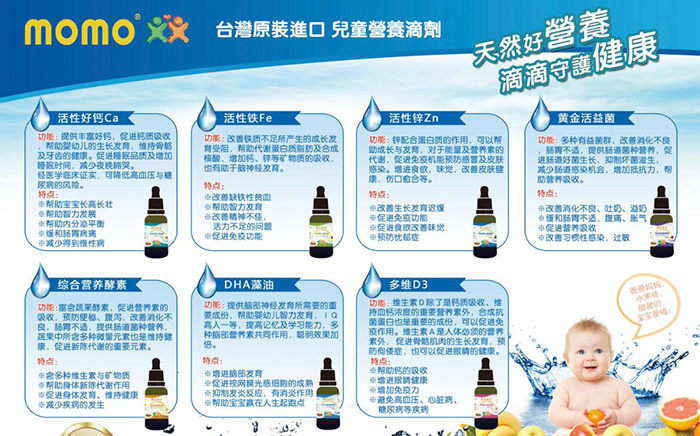 momo營(yíng)養(yǎng)素滴劑系列,100%臺(tái)灣原罐原裝,正規(guī)進(jìn)口食品,安全有保障。臺(tái)灣專業(yè)研發(fā)團(tuán)隊(duì),采用本土原材料,采用嚴(yán)格的自我生產(chǎn)管理系統(tǒng),從 產(chǎn)品開發(fā)、原來生產(chǎn)到末端產(chǎn)品的包裝,提供完整的品質(zhì)服務(wù),F(xiàn)正面向全國(guó)招商中,有意向者現(xiàn)在就可以通過火爆嬰童網(wǎng)進(jìn)行留言咨詢。