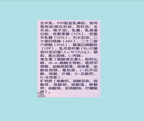 蓓萌羊奶粉是新政后工廠生存和發(fā)展的核心品牌,采用的高山牧場奶源,純凈安全,添加OPO結構脂和D90脫鹽乳清粉,全面提升寶寶成長發(fā)育所需營養(yǎng)和對營養(yǎng)的吸收及利用,同時,采用國際國內先進的生產技術和產品檢測技術,專注每一罐蓓萌羊奶粉的安全品質,呵護每一位寶寶健康成長。