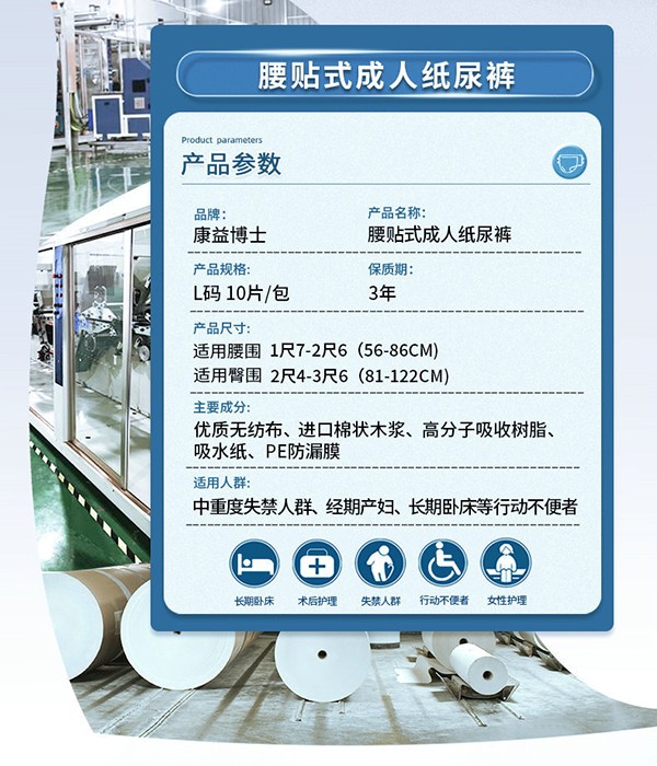 康益博士成人紙尿褲,產(chǎn)品具有大吸量、呵護(hù)肌膚、除臭去味等特點(diǎn),同時還兼具更好的親膚性、防漏性與透氣性,保證穿起來更加舒適,穿著不會覺得悶,不懼側(cè)漏,避免尷尬。