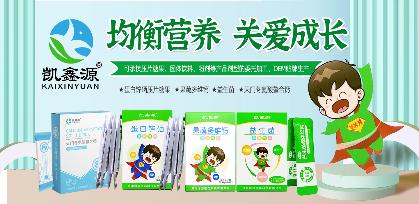 凱鑫源是濟(jì)南綠源醫(yī)藥科技有限公司旗下品牌,擁有蛋白鋅硒壓片糖果、果蔬多維鈣固體飲料、益生菌固體飲料、天門冬氨酸鈣固體飲料、山楂內(nèi)金片、雙花苦瓜片、菊苣梔子片等多個市場暢銷產(chǎn)品;并可對外承接壓片糖果、固體飲料、散劑等產(chǎn)品劑型的委托加工、OEM貼牌生產(chǎn)。