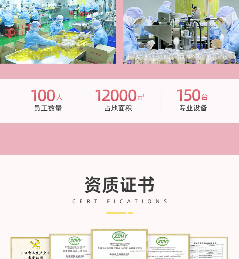 漳州童世界食品有限公司主營一站式代加工OEM業(yè)務(wù),致力于健康兒童食品、功能性代餐食品、凍干燕窩的研發(fā)與生產(chǎn),公司占地面積12000平方米,始終秉承已科技為先導(dǎo)、以先進(jìn)的現(xiàn)代化管理依托、已“顧客滿意第一”為宗旨的經(jīng)營方針、致力發(fā)展成為一家研發(fā)和制造健康、美味、營養(yǎng)的食品企業(yè)。 公司的誠信、實(shí)力和產(chǎn)品質(zhì)量獲得業(yè)界的認(rèn)可。歡迎各界朋友蒞臨參觀、指導(dǎo)和業(yè)務(wù)洽談。