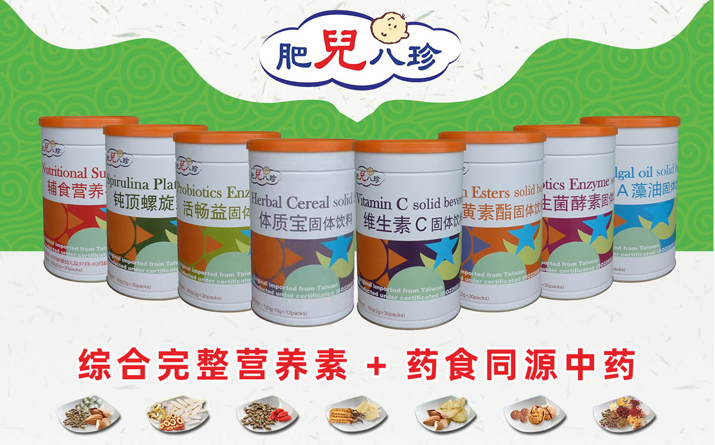 肥兒八珍藥食同源固體飲料系列有八款單品,分別是谷寶草本、輔食營養(yǎng)補(bǔ)充品、活暢益、維生素、DHA藻油、鈍頂螺旋藻、葉黃素酯、益生菌酵素。