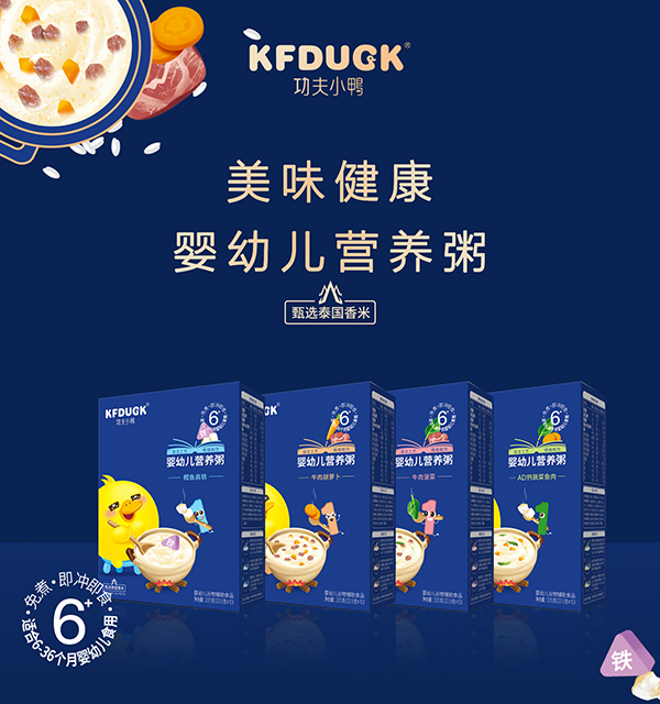 功夫小鴨嬰幼兒營養(yǎng)粥系列,有AD鈣蔬菜魚肉、牛肉菠菜、牛肉胡蘿卜、鱈魚高鐵,共四款單品,均選優(yōu)質原料制作,搭配多種新鮮食材,營養(yǎng)豐富,口感美味。