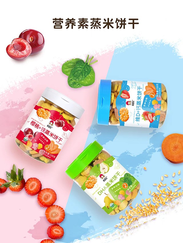 果蔬妃櫻桃+鐵蒸米餅干,融合了多種谷物和果蔬成分的小動物造型餅干,采用蒸米工藝,清香酥脆,口齒留香!特別加入營養(yǎng)素,營養(yǎng)更豐富,有DHA、櫻桃+鐵和維D+鈣3種口味,適合9個月以上寶寶食用。
