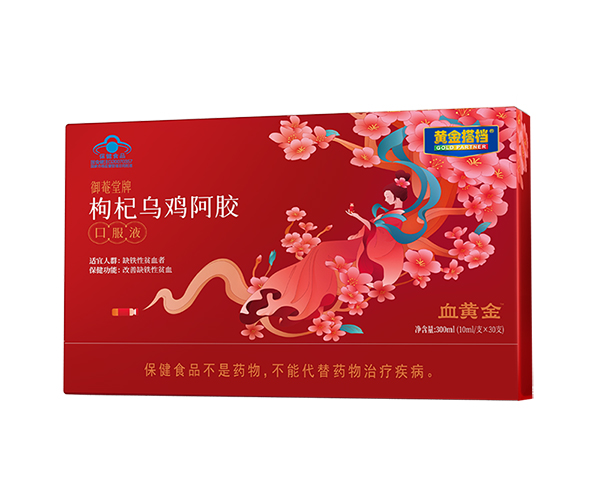黃金搭檔枸杞烏雞阿膠口服液,藍帽保健食品,為缺鐵性貧血者精心研制!專注補鐵補血,名副其實的“血黃金”!精選優(yōu)質食材配以藥食兩用原料,如烏雞、枸杞子、大棗、阿膠以及葡萄糖酸亞鐵等等,同時添加多種微量元素,營養(yǎng)成分含量更高,更均衡!每100ml含鐵31.5mg,含粗多糖61mg,上乘滋補,溫和好吸收,喚醒好氣色!