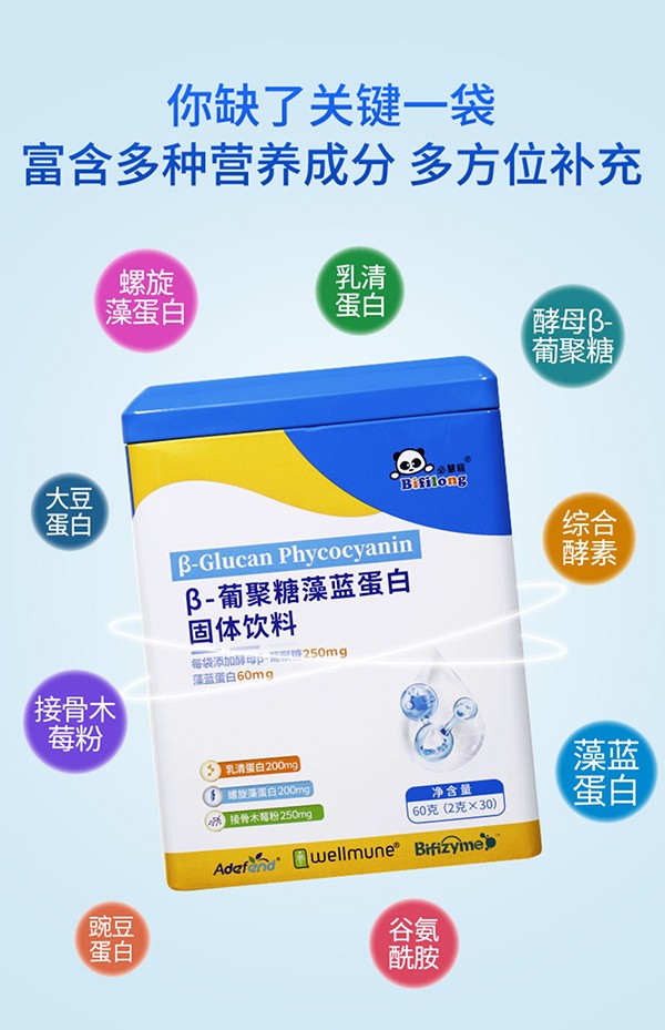 必慧龍β-葡聚糖藻藍(lán)蛋白,硬核雙保護(hù),解鎖好體質(zhì)!含量高,添加量足,原廠專利原料認(rèn)證授權(quán),富含多種營(yíng)養(yǎng)成分,多方位全面補(bǔ)充!每袋添加美國(guó)專利酵母β-葡聚糖250mg,乳清蛋白200mg,藻藍(lán)蛋白60mg,螺旋藻蛋白200mg以及接骨木莓粉250mg,同時(shí)特別添加綜合酵素及多種維生素,一袋滿足每日保護(hù)力所需!不含防腐劑、人工色素、麩質(zhì),放心好選擇,給力助成長(zhǎng)!